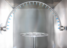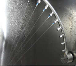 IPX3淋水试验时,摆管喷水的角度±60°,出水的喷孔比IPX4试验时少1/3左右。淋水的喷水只在试样的上部进行,对底部和试样下半部没有喷射到。相比较而言,IPX4则更加严格。进行IPX4防水等级测试时,整个半圆摆管的喷嘴都会喷水,而且摆管摆动角度是接近360°,整个形成一个球状的淋水效果。因此,IPX4用到“溅水”这个词来形容再贴切不过。如下图: