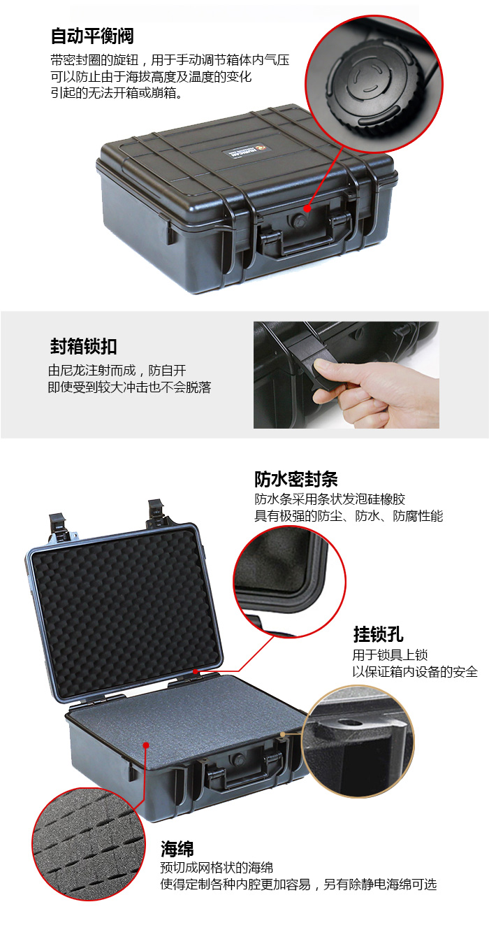 • 箱体由高抗冲ABS注射成型,坚固耐压,可根据要求定制具有耐低温的-40℃军用级防护箱