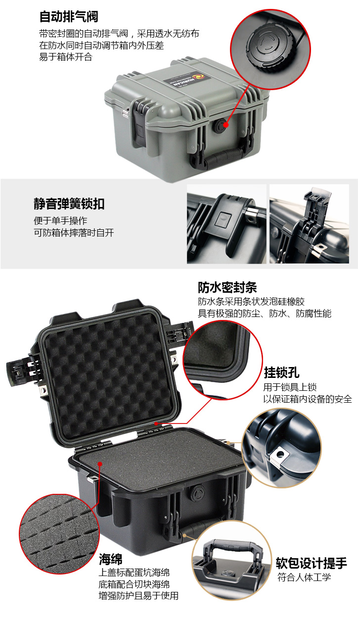 • 静音弹簧锁扣,便于单手操作,可防箱体摔落时自开
