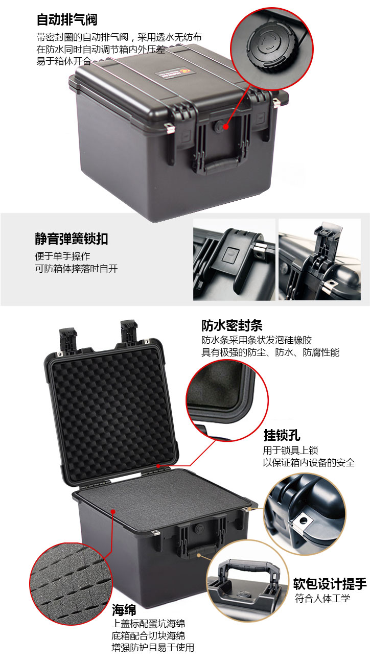 箱体前部有带密封圈的自动排气阀,采用透水无纺布,在防水同时自动调节箱内外压差,易于箱体开合