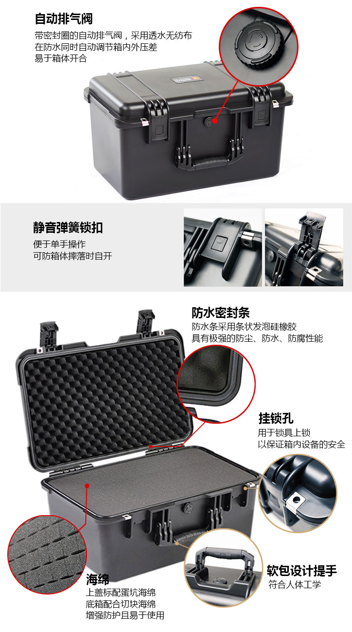 • 静音弹簧锁扣,便于单手操作,可防箱体摔落时自开