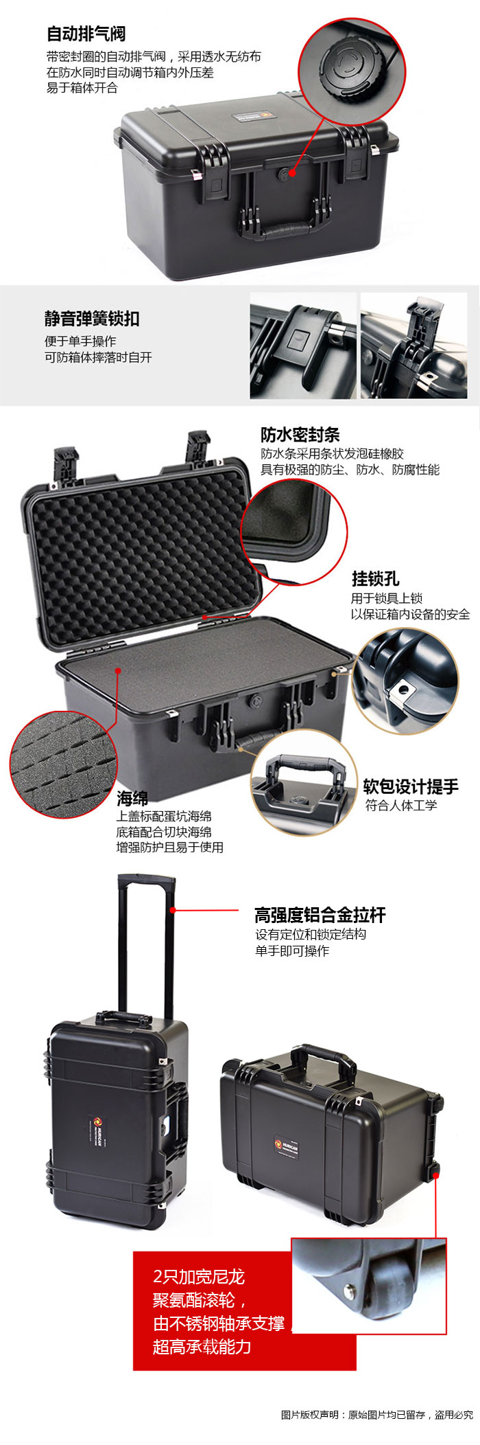 • 静音弹簧锁扣,便于单手操作,可防箱体摔落时自开