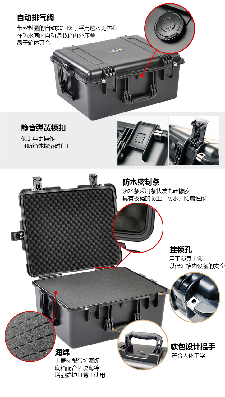 • 静音弹簧锁扣,便于单手操作,可防箱体摔落时自开